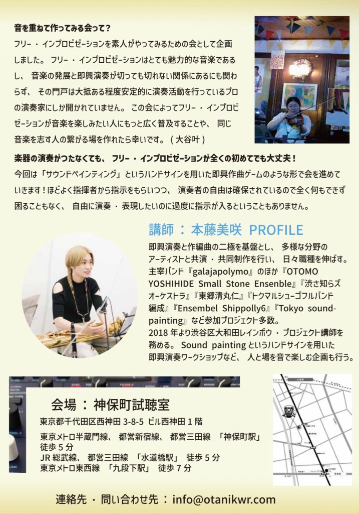 この会によって、フリー・インプロビゼーションが単純に音楽を楽しみたい人にもっと広く普及することや、同じ音楽を志す人が繋がれる場を作ることができれば、と思い会を企画しました。